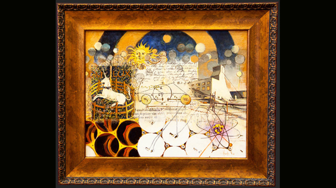 In this piece, titled "Dark matter—The quest continues," artist Bob Wilson uses dark matter as a metaphor for the many unknown, unquantified things in our universe. "From the first alchemists to present-day physicists using the most modern supercomputers, the quest to understand these properties has always preoccupied the most creative, most intelligent, most curious, and most talented of our species," he says.