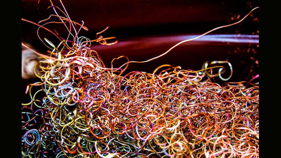 These copper shavings are some of the world’s purest copper, which is being manufactured in a clean room 4850 feet underground. The copper, almost totally free of impurities, is being used to make parts for the Majorana Demonstrator experiment. Photo by Matt Kapust.