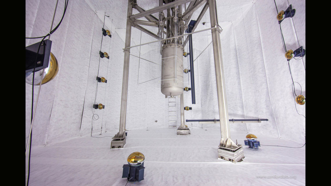 The Large Underground Xenon dark matter detector is seen here after it was installed at the center of a water tank that will be filled with more than 70,000 gallons of ultra-pure deionized water. The water will shield the detector from background radiation. Photo by Matt Kapust.