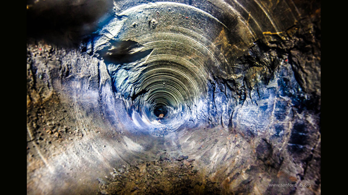 This photo shows a hole about five inches in diameter that was drilled on the 4850-foot level of the Sanford Underground Research Facility. Geologists drill holes like this one to extract core samples of rock. Photo by Matt Kapust.