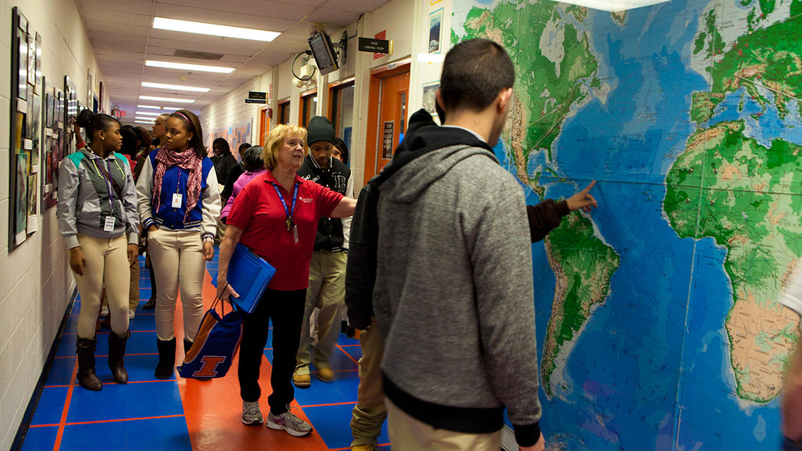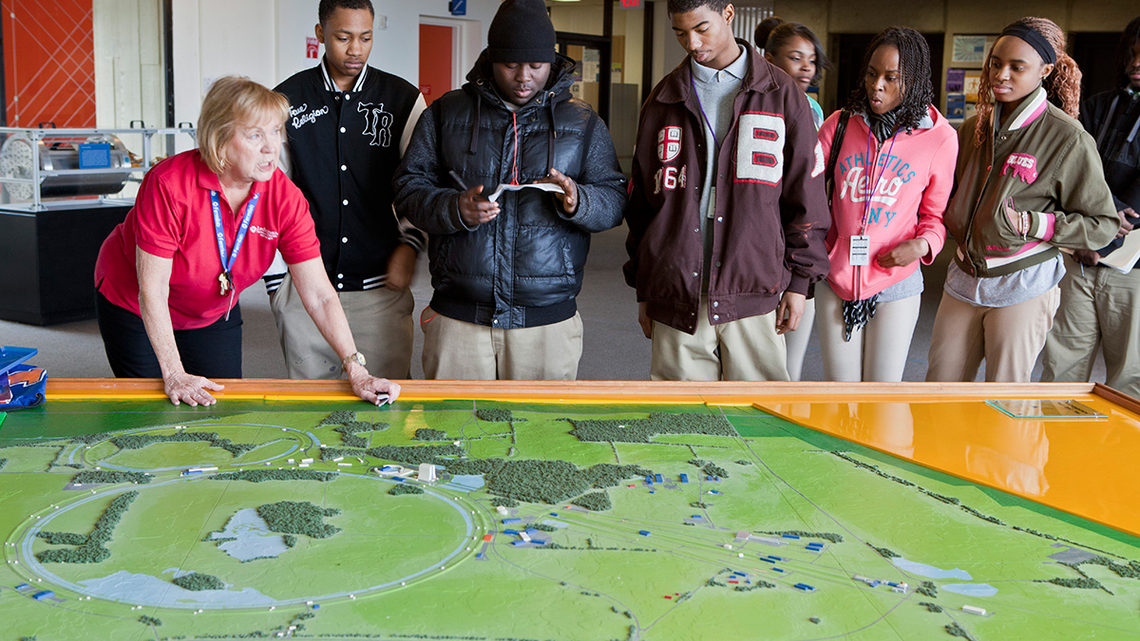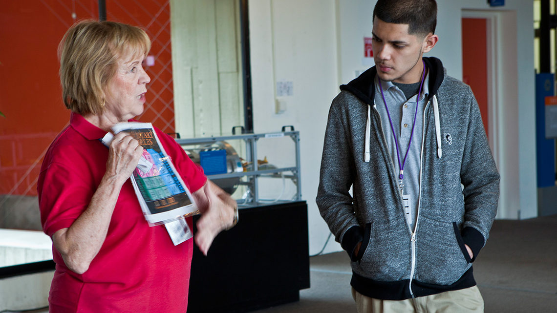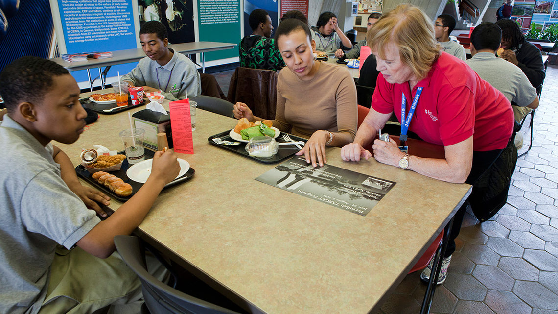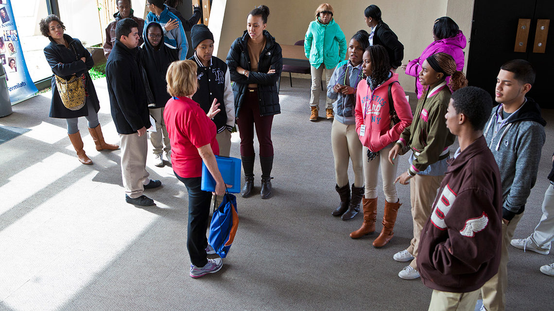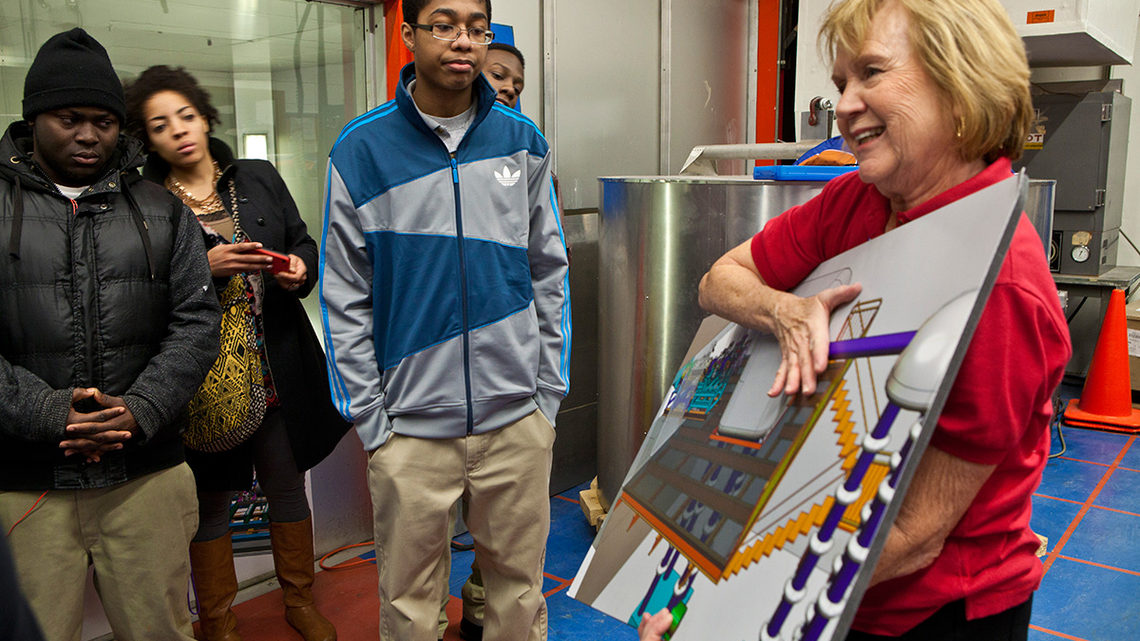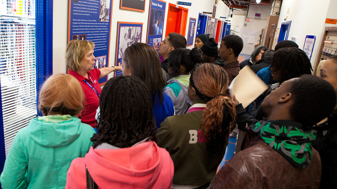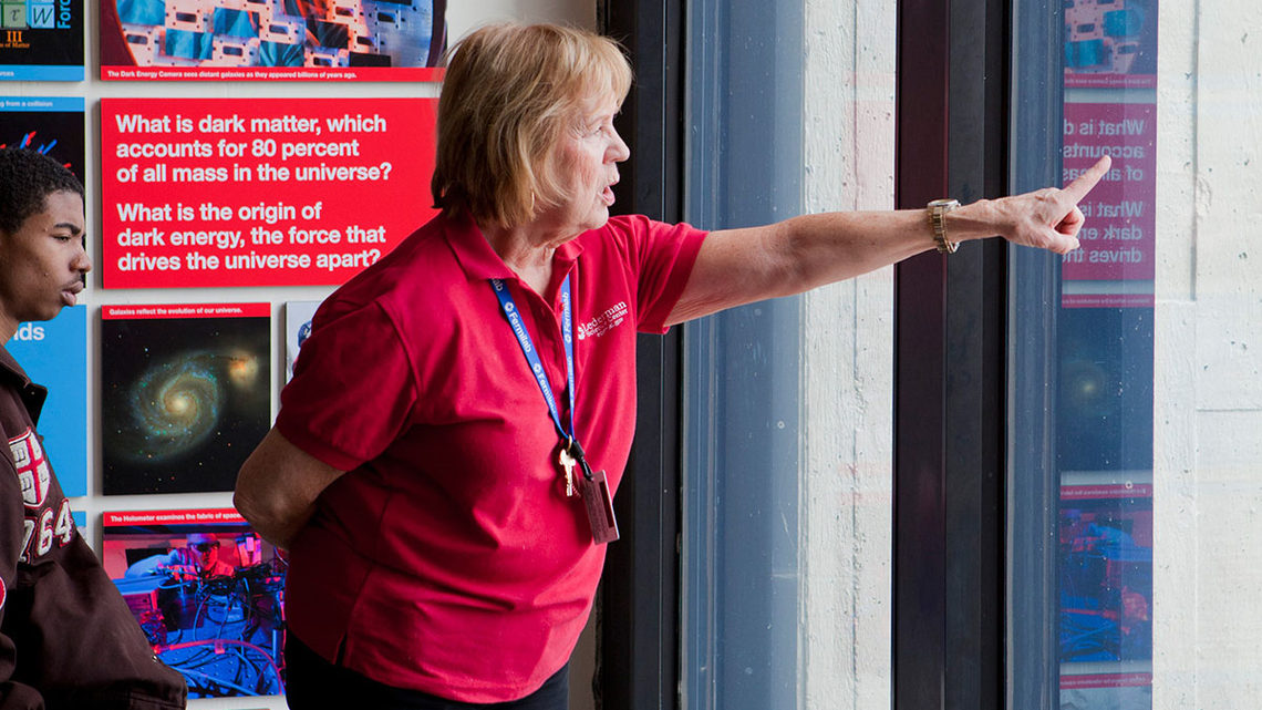 Fermilab Docent Felicia Svoboda gives students a tour of the display area in Fermilab's Wilson Hall.